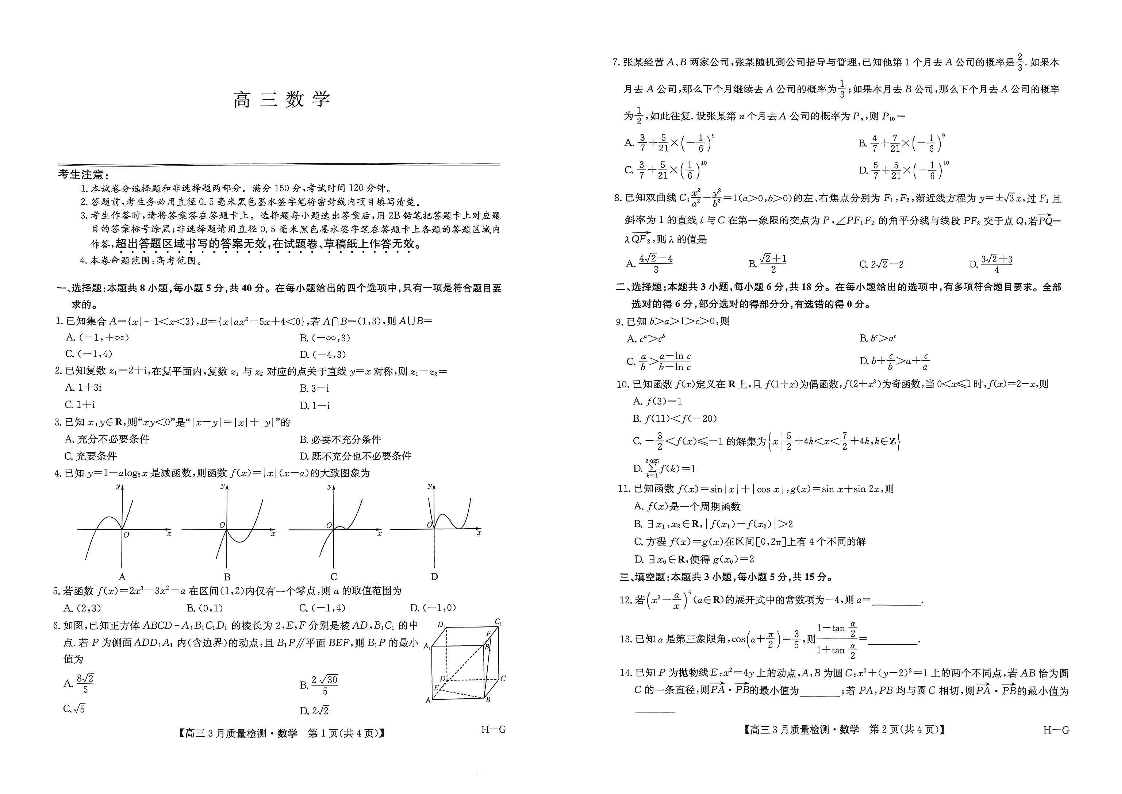 九师联盟2025届高三3月质量检测巩固卷(G)数学