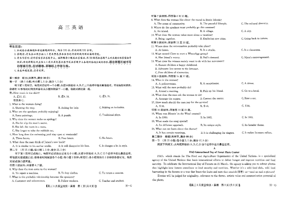 九师联盟2025届高三3月质量检测巩固卷(G)英语