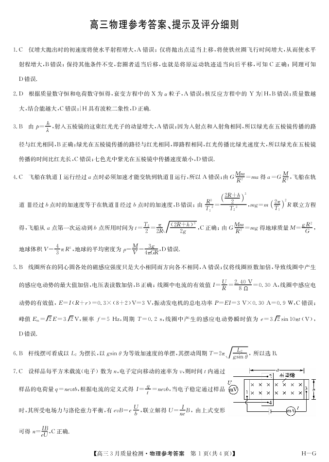 九师联盟2025届高三3月质量检测巩固卷(G)物理答案