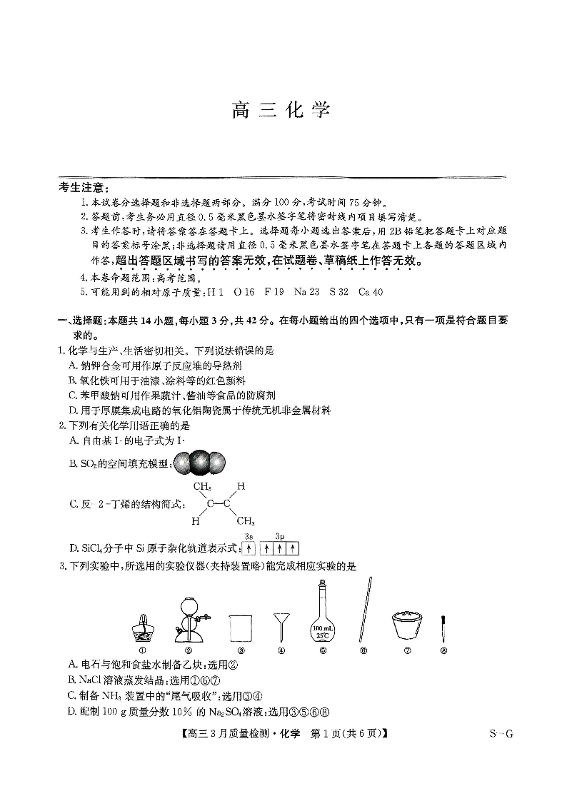 九师联盟2025届高三3月质量检测巩固卷(G)化学