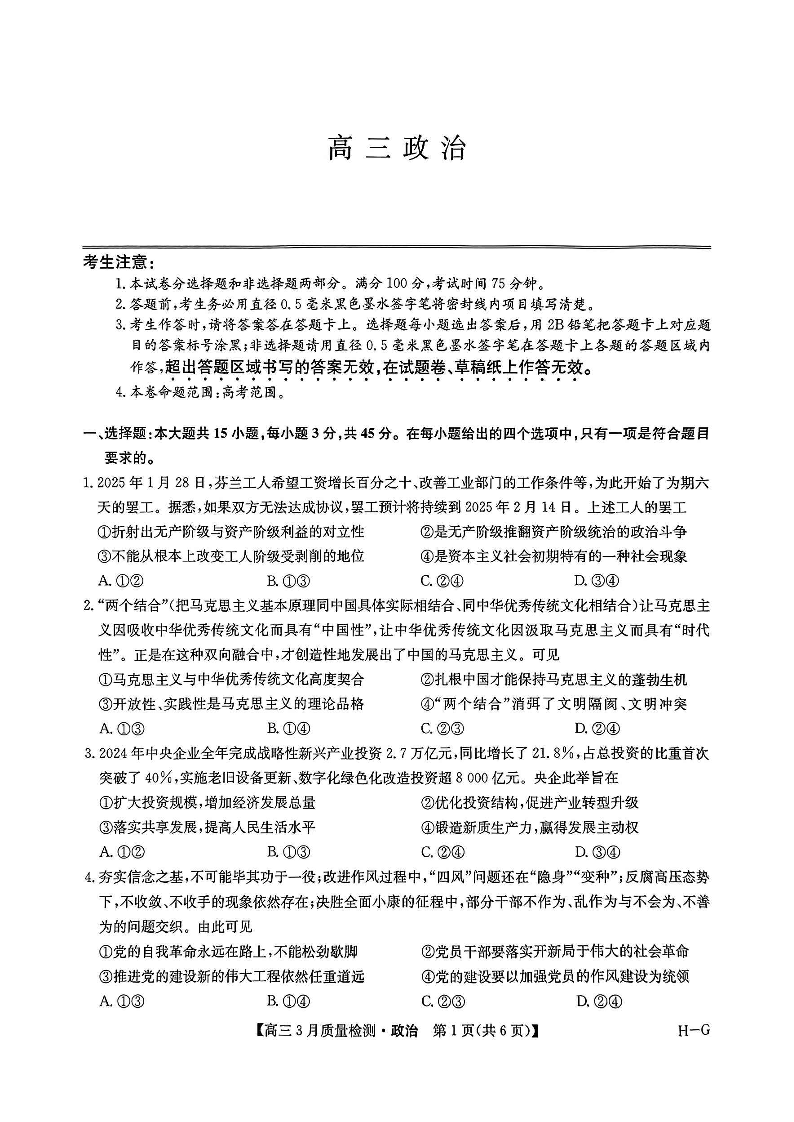 九师联盟2025届高三3月质量检测巩固卷(G)政治