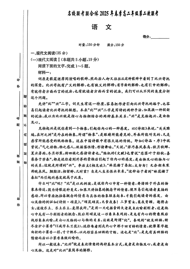 湖南省炎德英才名校联考联合体2024-2025学年高二下学期3月月考语文+答案