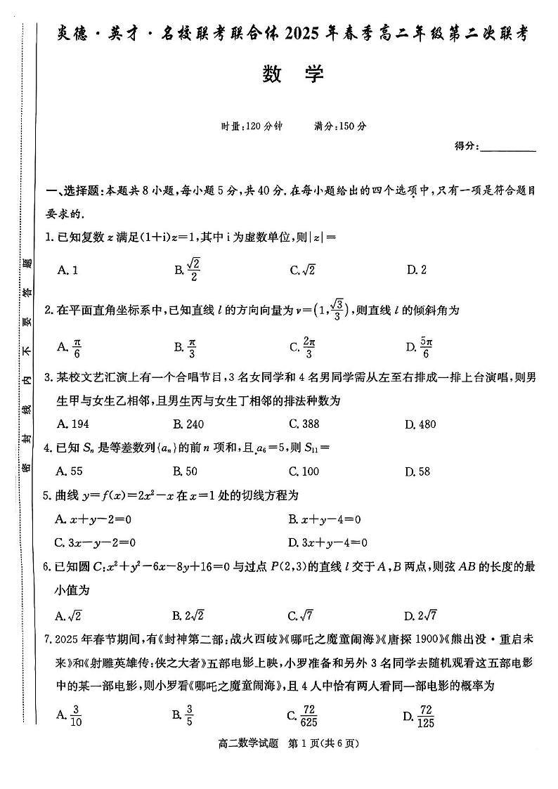 湖南省炎德英才名校联考联合体2024-2025学年高二下学期3月月考数学+答案