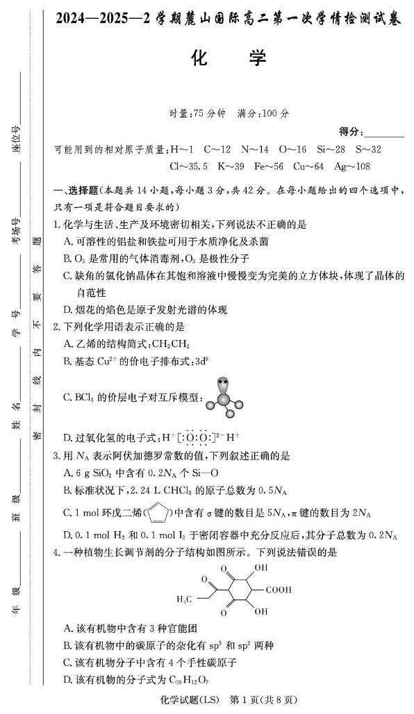 湖南省长沙市麓山国际实验学校2024-2025学年高二下学期第一次学情检测化学+答案