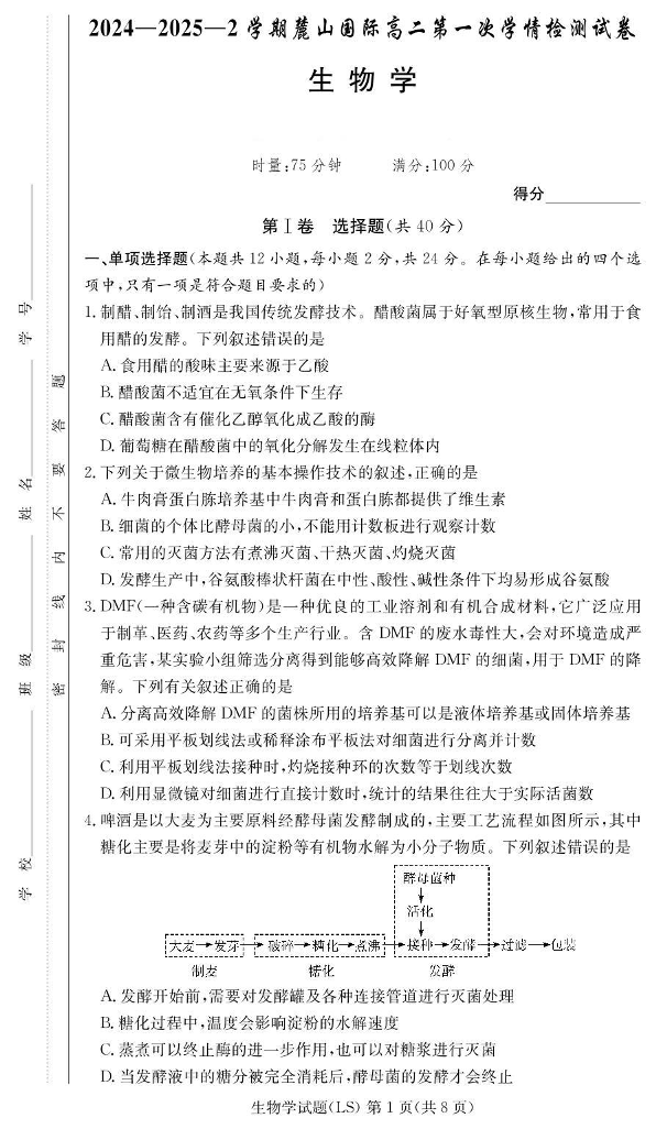湖南省长沙市麓山国际实验学校2024-2025学年高二下学期第一次学情检测生物+答案