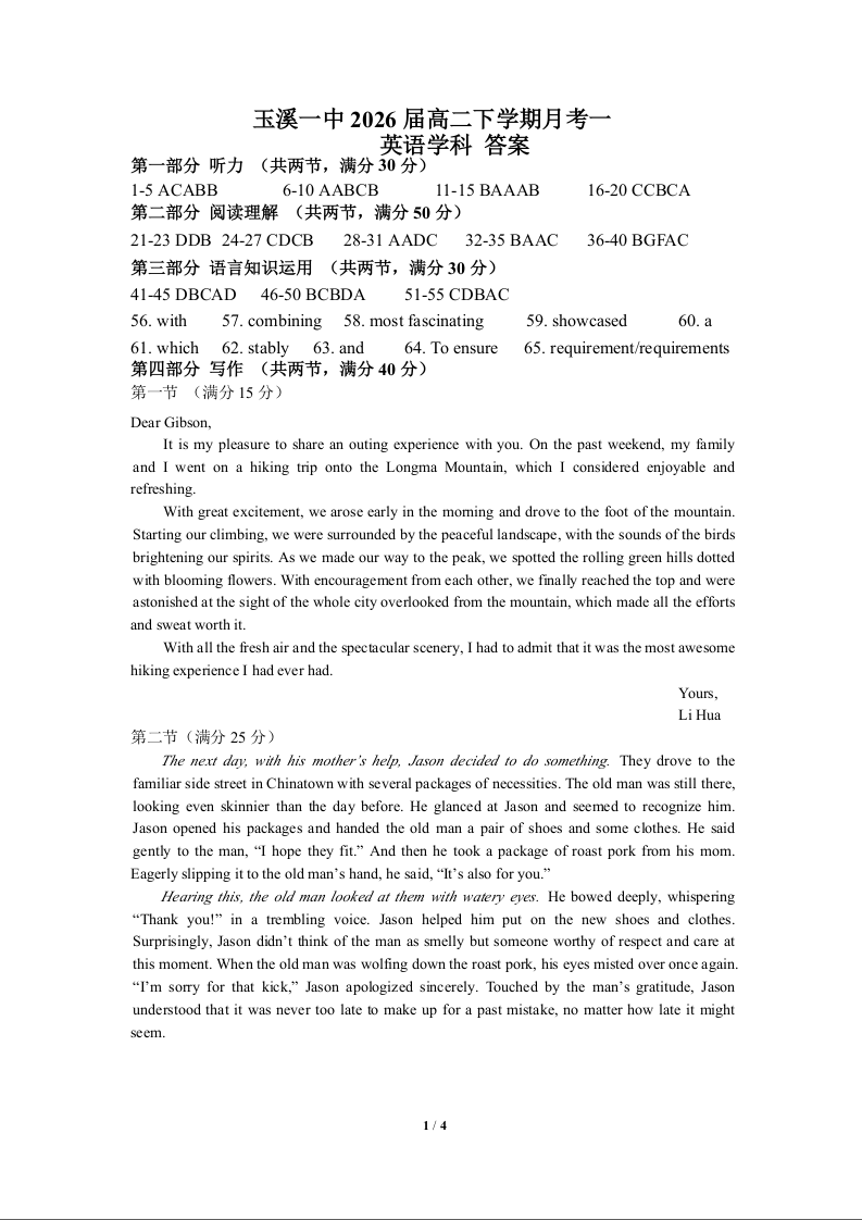 云南省玉溪市一中2024-2025学年高二下学期3月月考英语答案