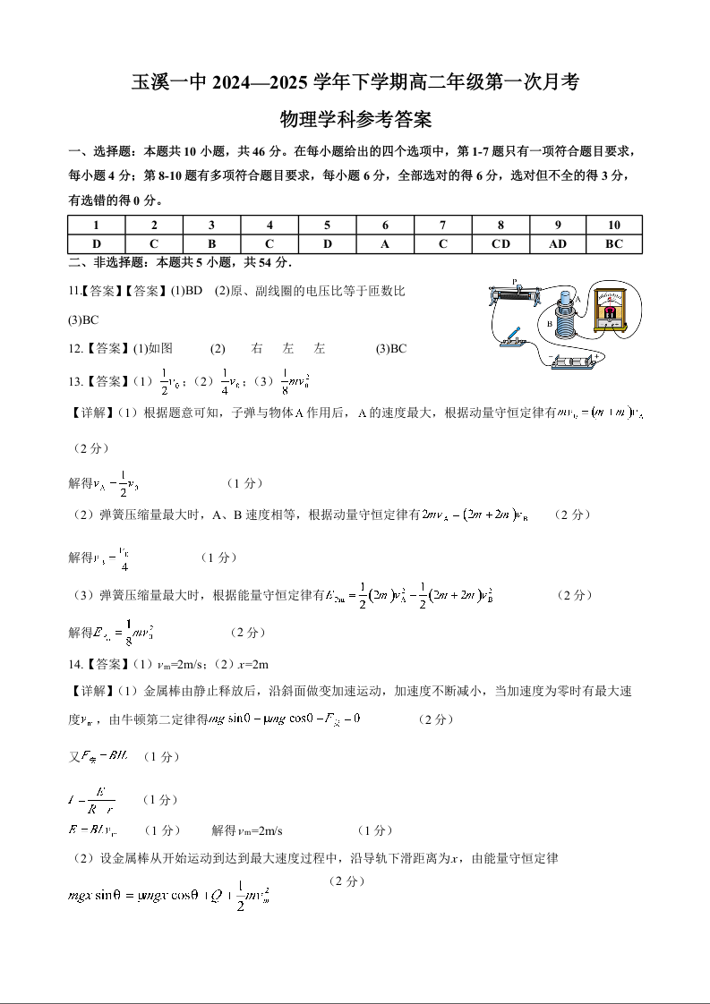 云南省玉溪市一中2024-2025学年高二下学期3月月考物理答案