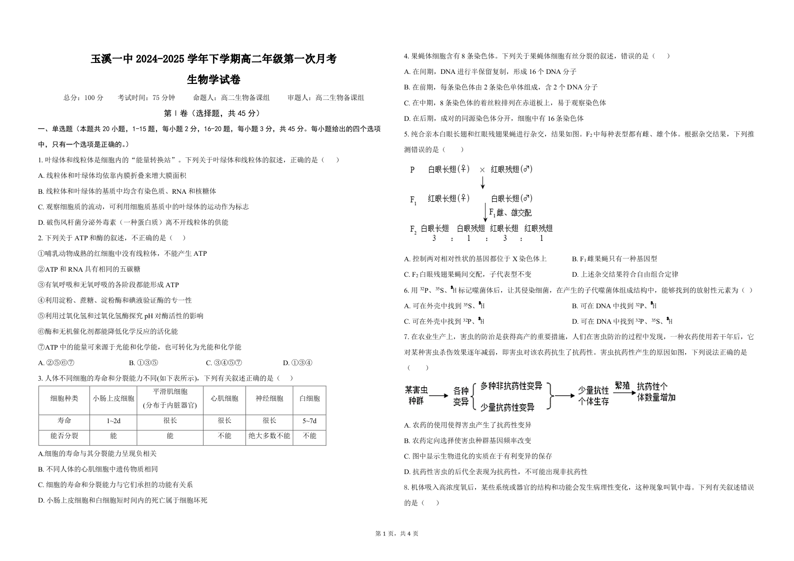 云南省玉溪市一中2024-2025学年高二下学期3月月考生物