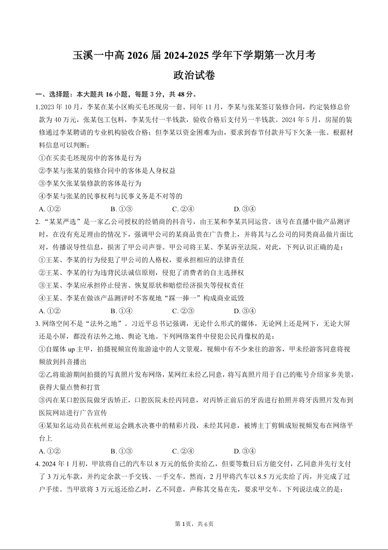 云南省玉溪市一中2024-2025学年高二下学期3月月考政治