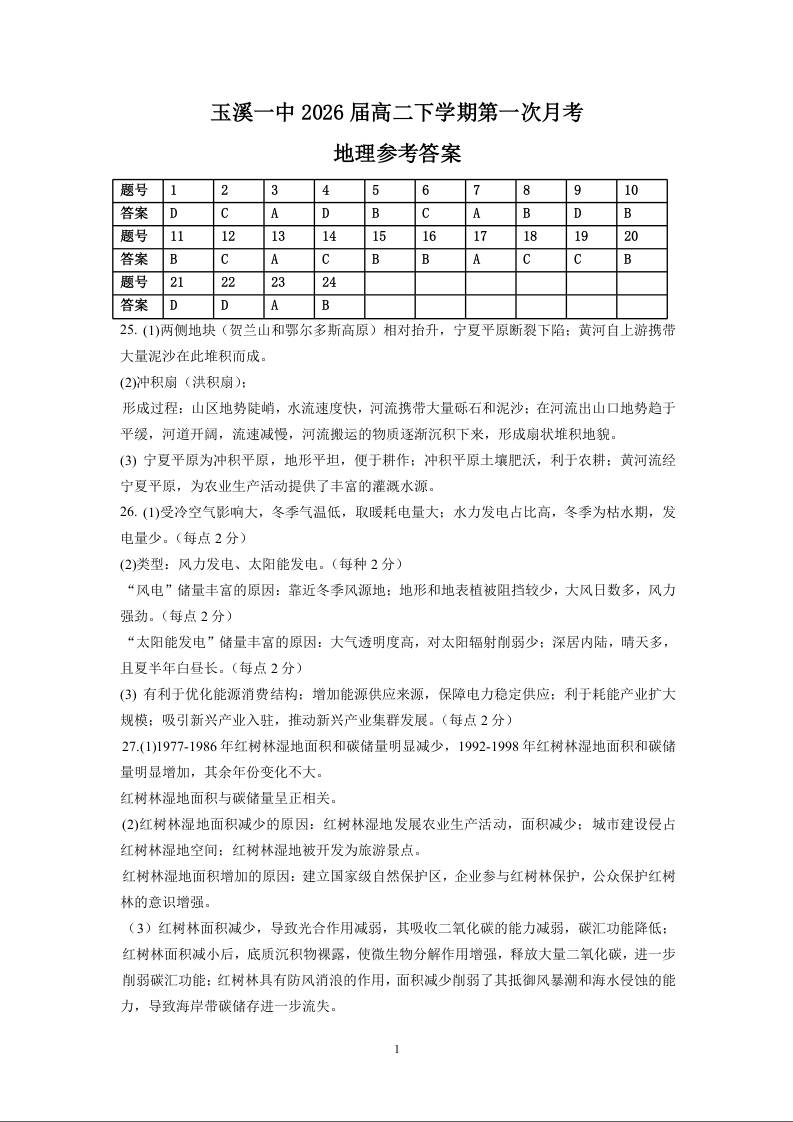 云南省玉溪市一中2024-2025学年高二下学期3月月考地理答案