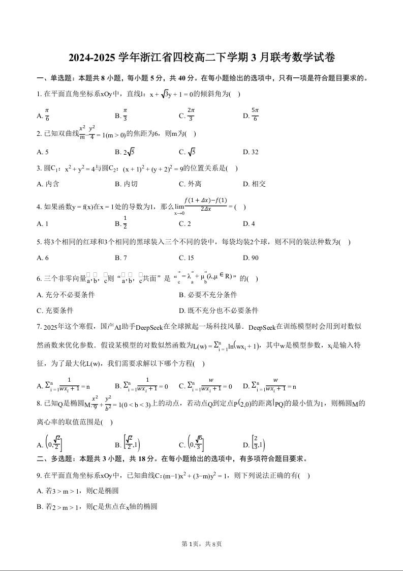 浙江省四校联盟2024-2025学年高二下学期3月联考数学+答案