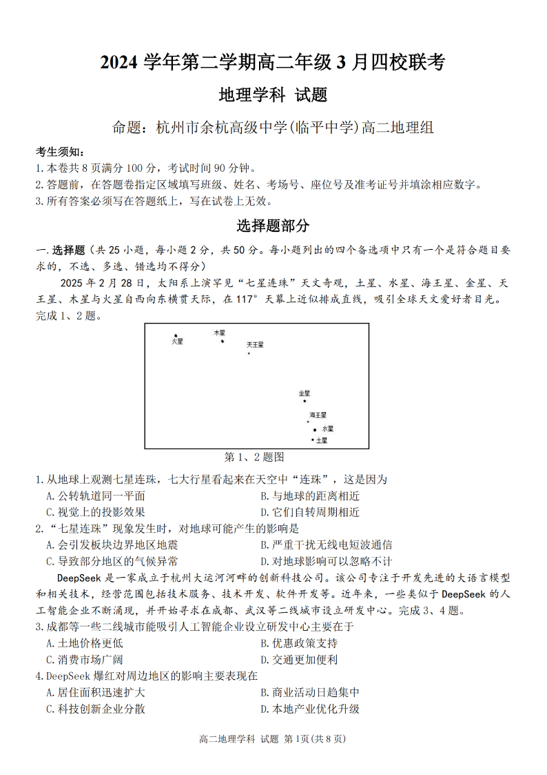 浙江省四校联盟2024-2025学年高二下学期3月联考地理+答案
