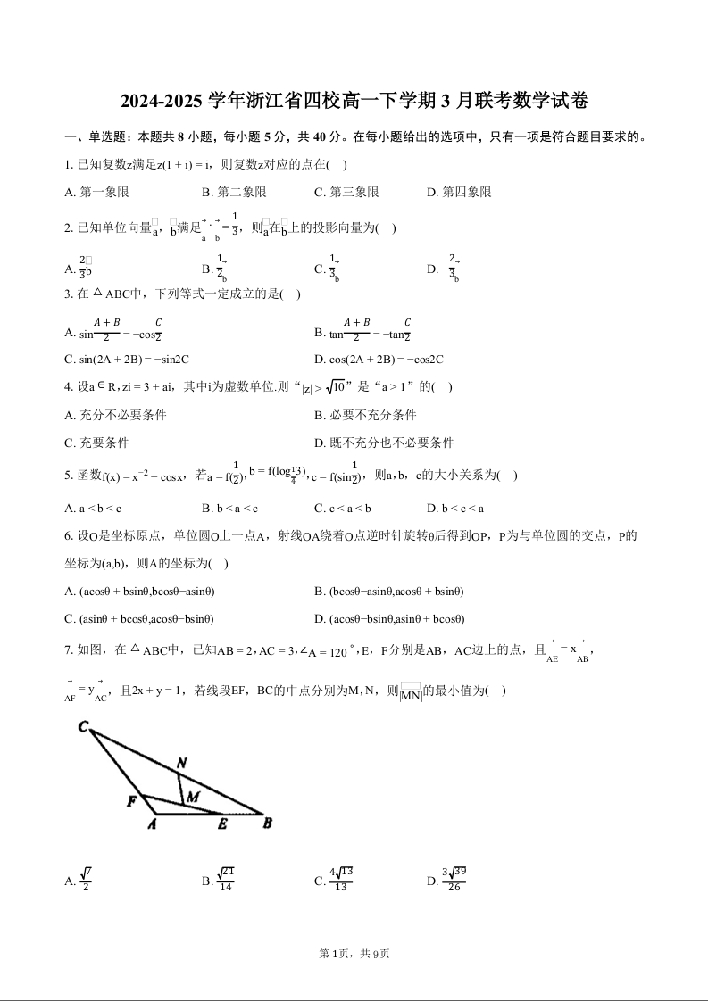 浙江省四校联盟2024-2025学年高一下学期3月联考数学+答案