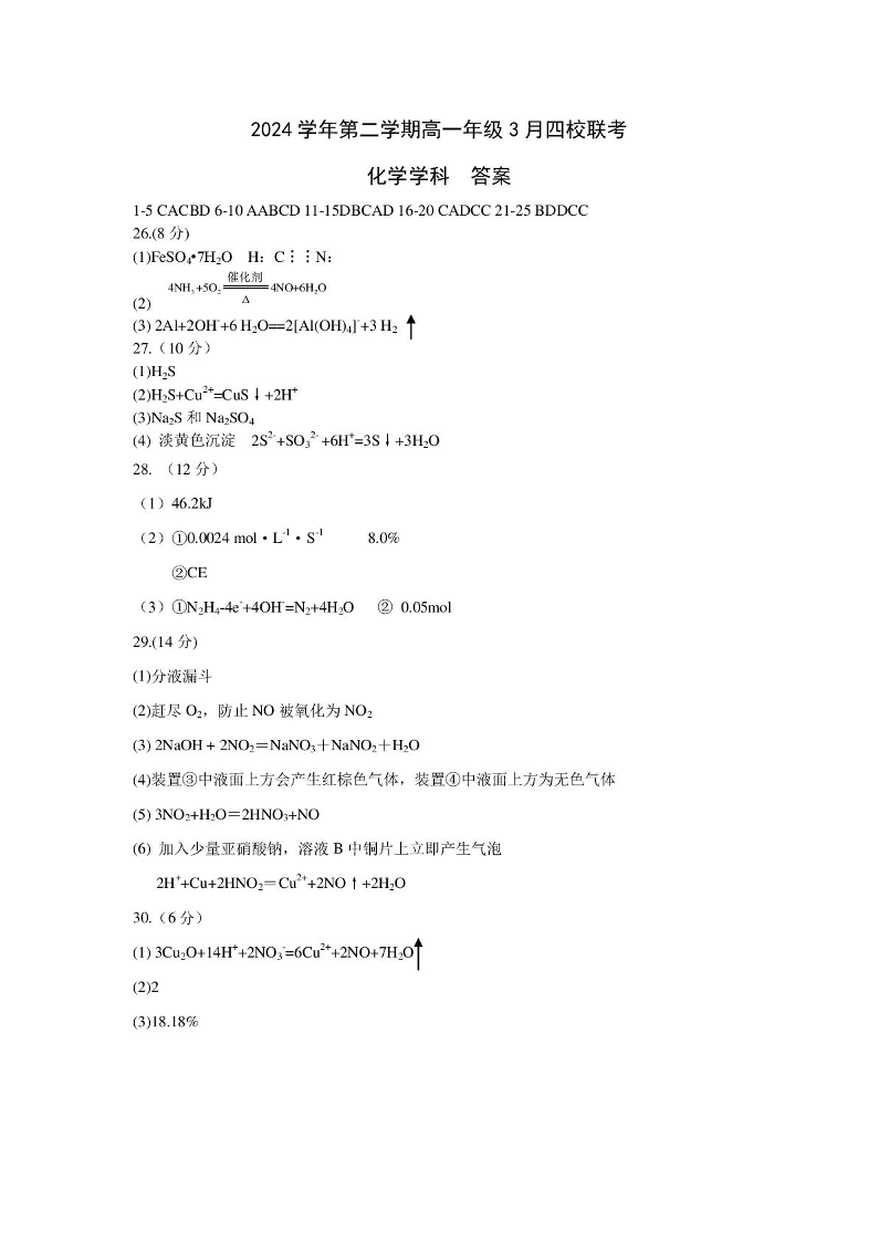 浙江省四校联盟2024-2025学年高一下学期3月联考化学答案