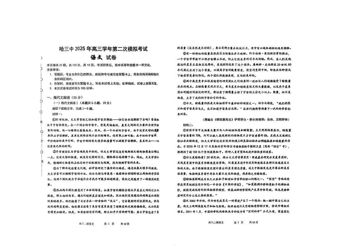 黑龙江省哈尔滨第三中学校2025年高三学年第二次模拟考试语文
