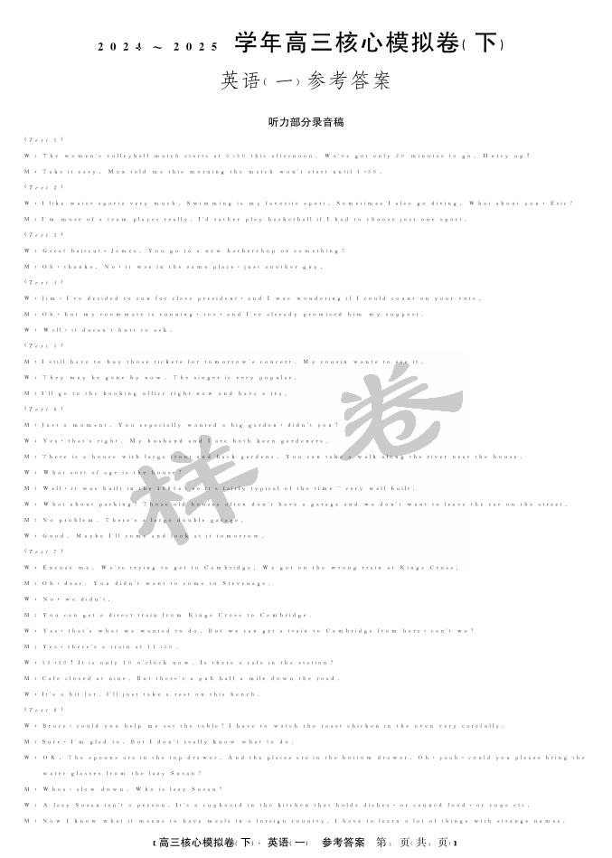 湖北省九师联盟2025届核心模拟卷(下)英语答案