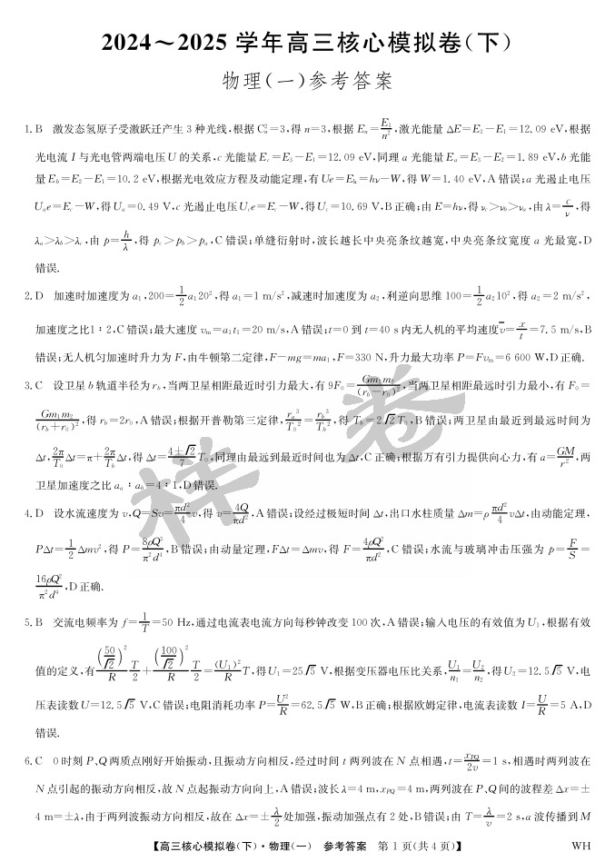 湖北省九师联盟2025届核心模拟卷(下)物理答案
