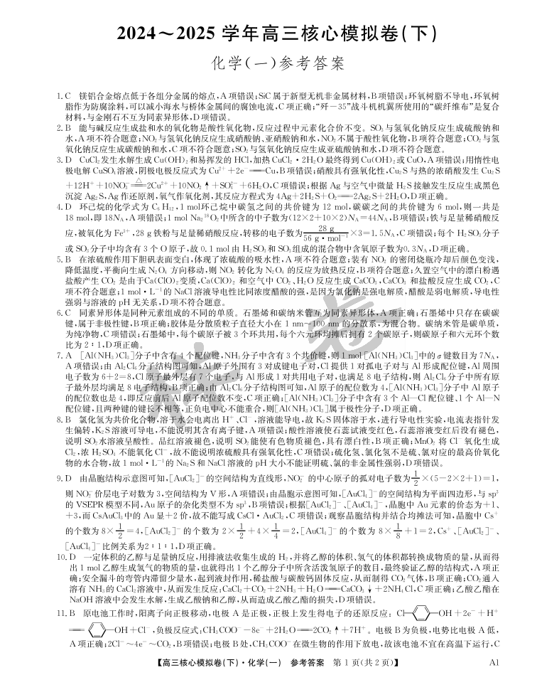 湖北省九师联盟2025届核心模拟卷(下)化学答案