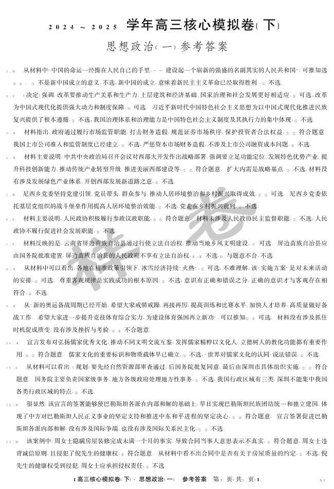 湖北省九师联盟2025届核心模拟卷(下)政治答案
