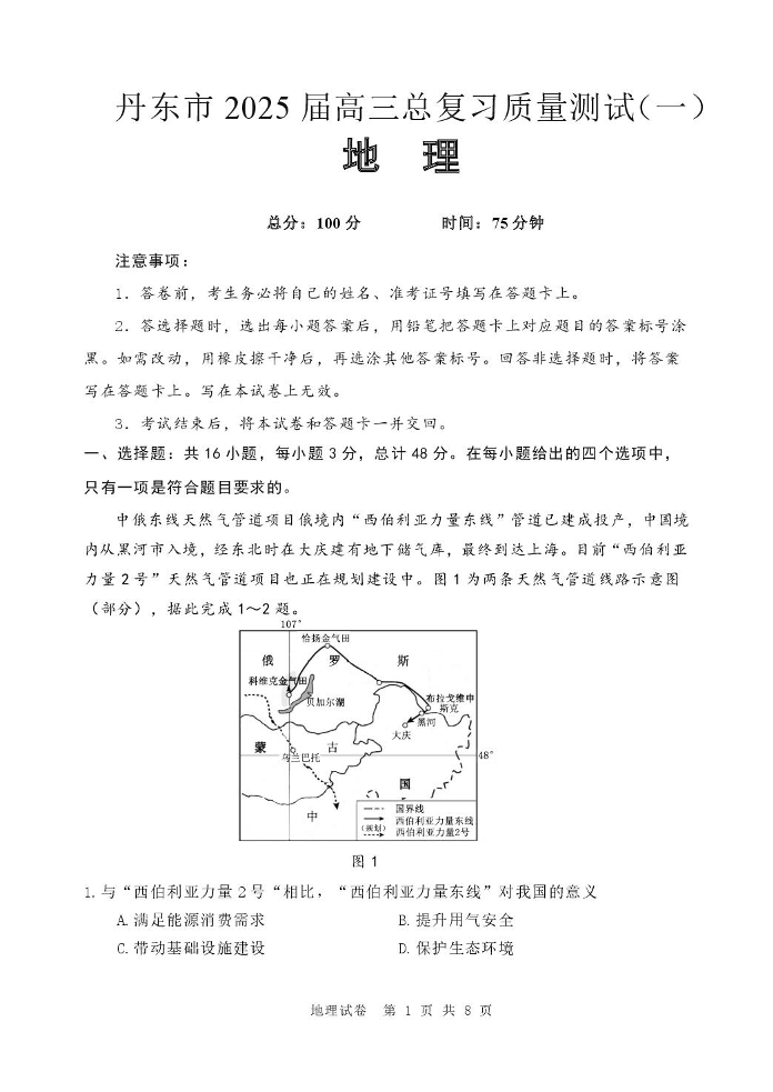 辽宁省丹东市2025届高三下学期3月总复习质量测试(一)地理+答案