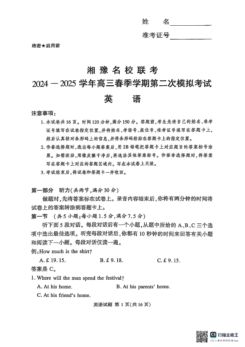 湘豫名校联考2025届高三下学期第二次模拟考试英语