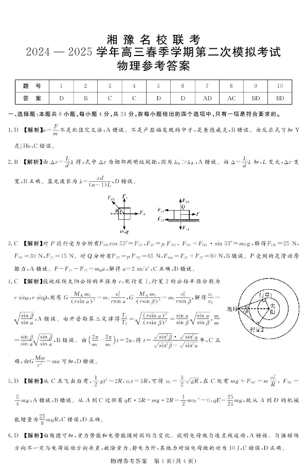 湘豫名校联考2025届高三下学期第二次模拟考试物理答案