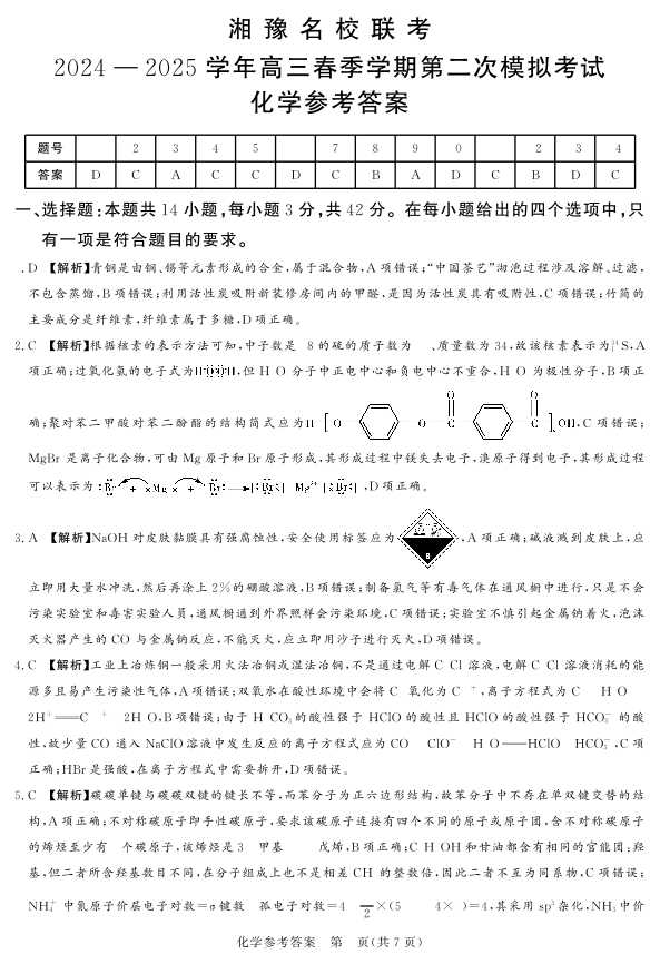湘豫名校联考2025届高三下学期第二次模拟考试化学答案