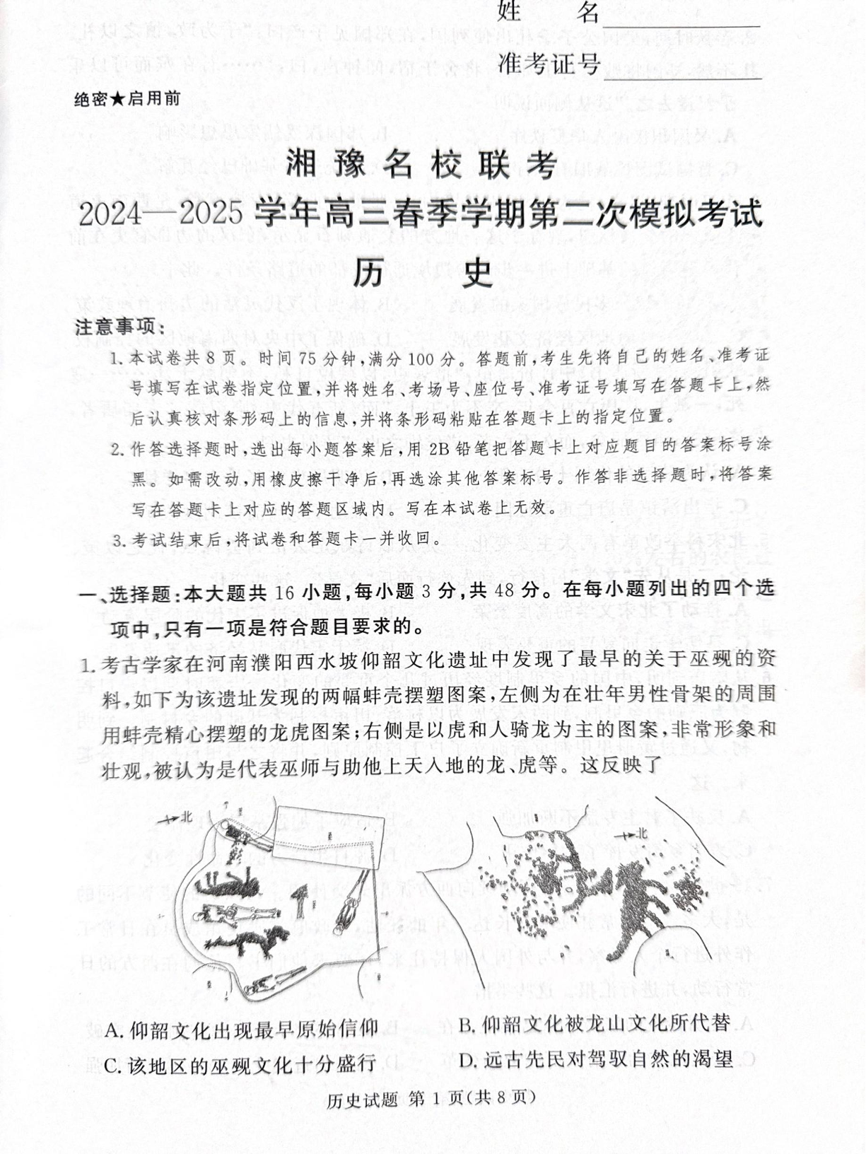 湘豫名校联考2025届高三下学期第二次模拟考试历史+答案