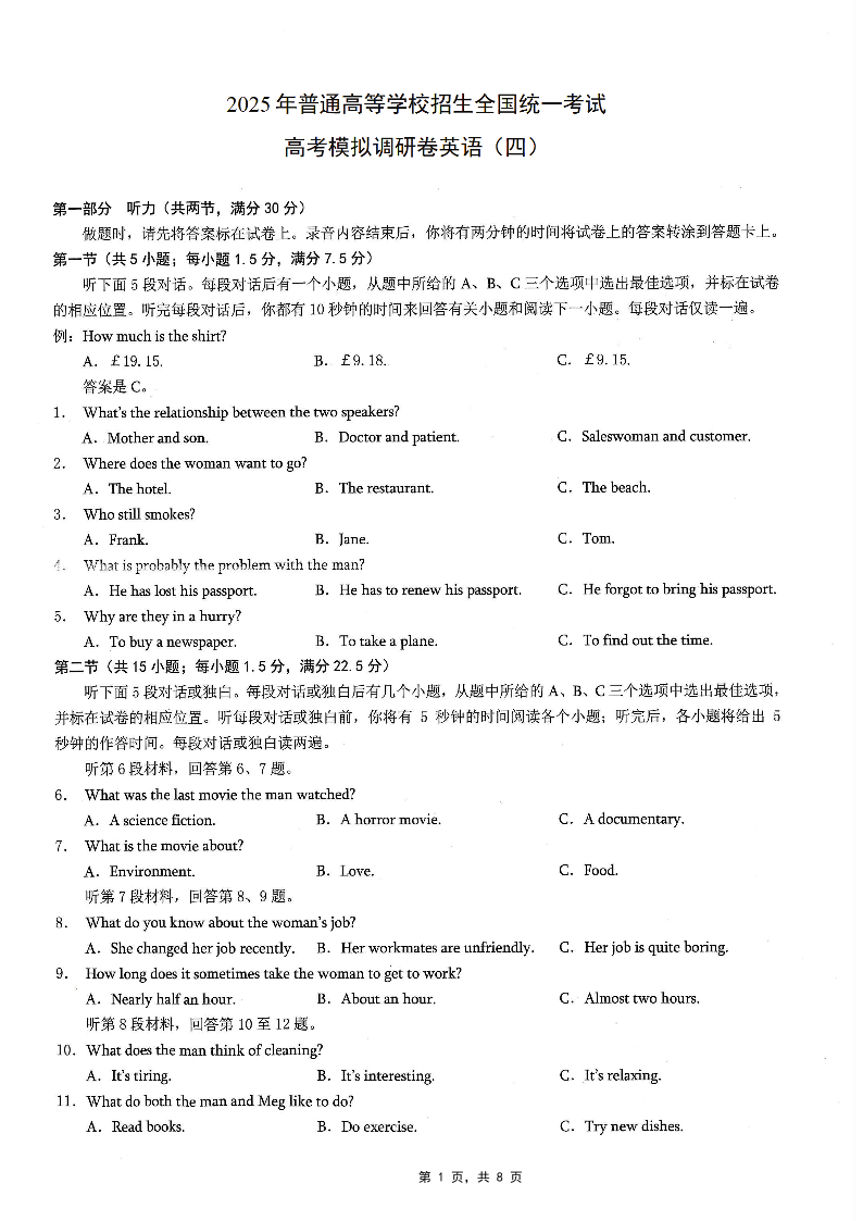 重庆市2025年普通高等学校招生全国统一考试康德调研(四)英语