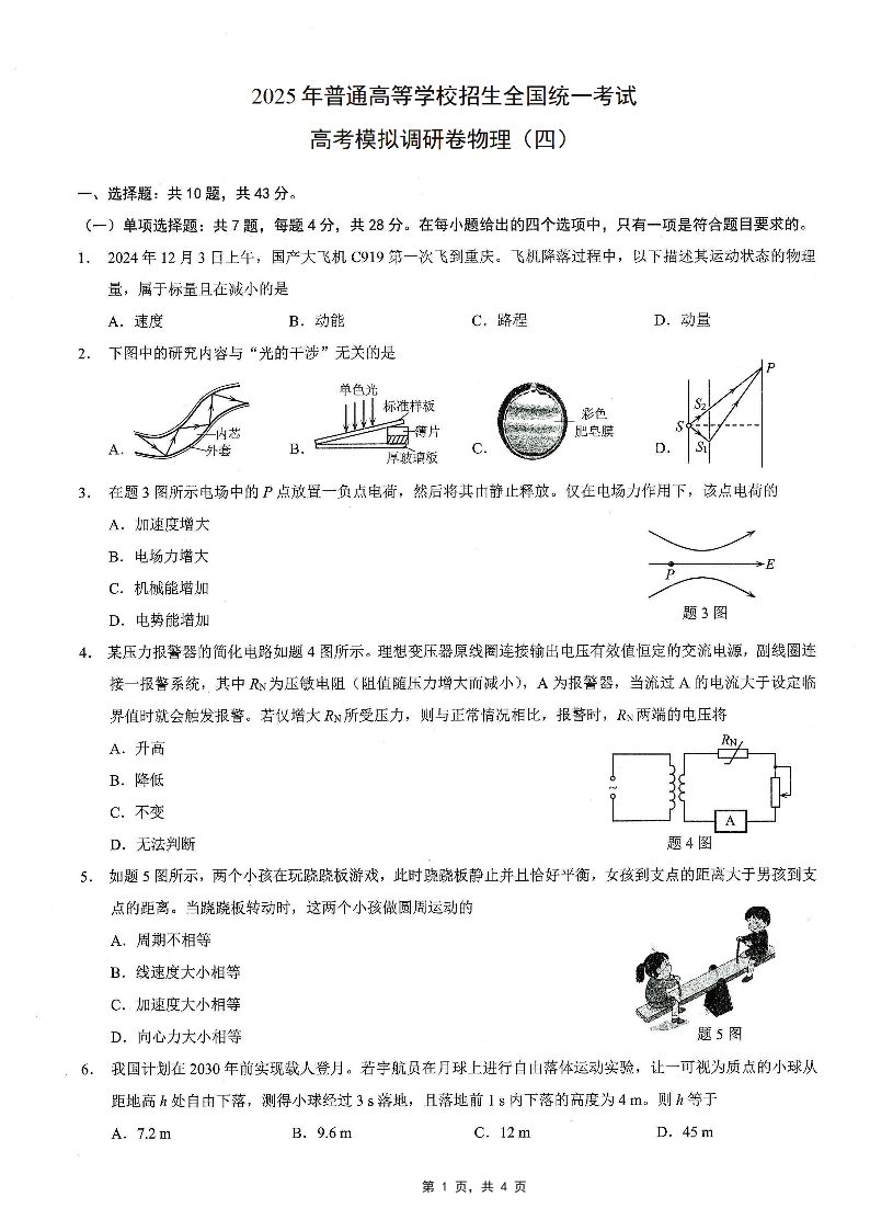 重庆市2025年普通高等学校招生全国统一考试康德调研(四)物理