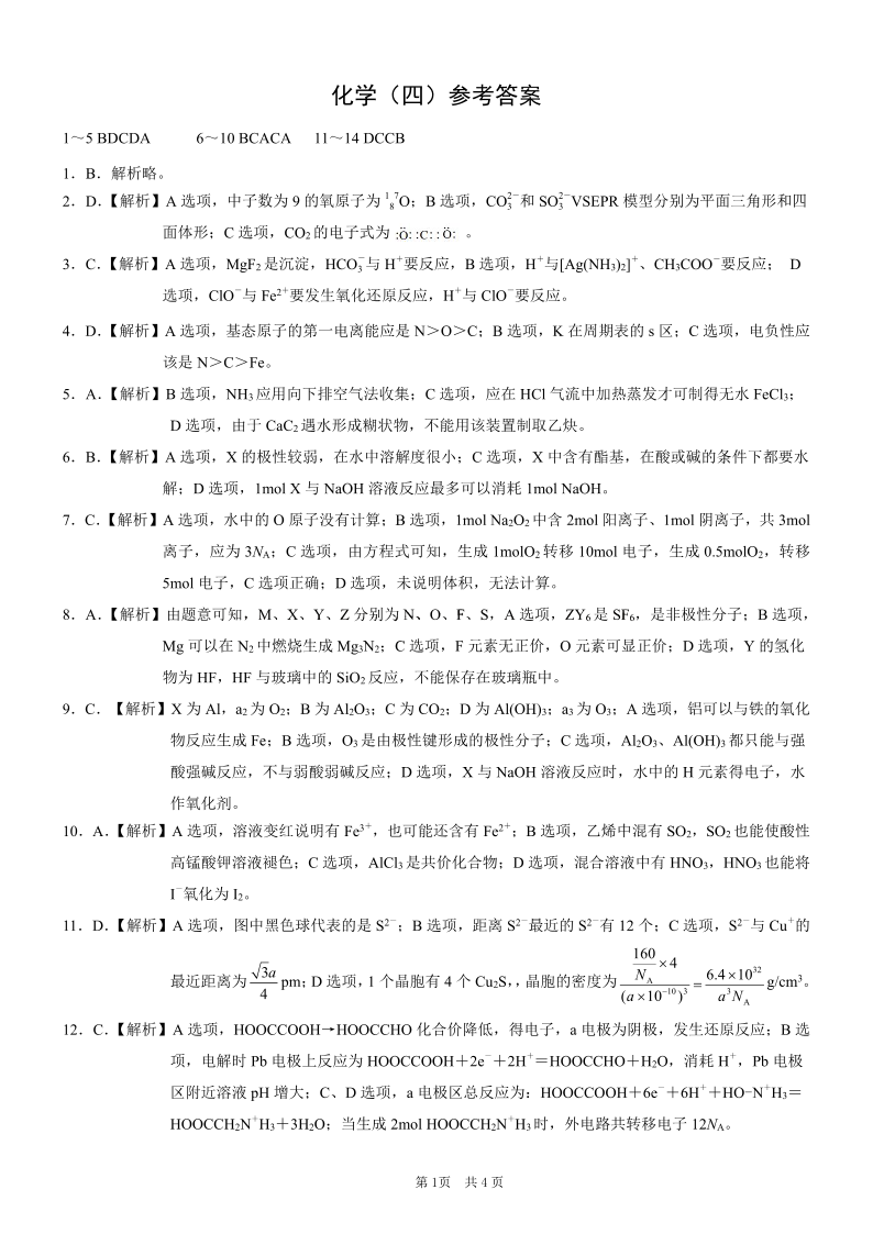 重庆市2025年普通高等学校招生全国统一考试康德调研(四)化学答案