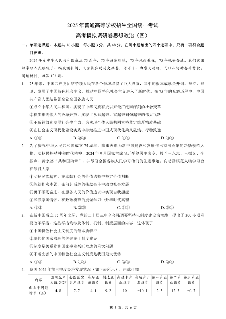 重庆市2025年普通高等学校招生全国统一考试康德调研(四)政治