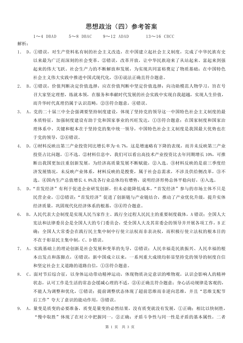 重庆市2025年普通高等学校招生全国统一考试康德调研(四)政治答案