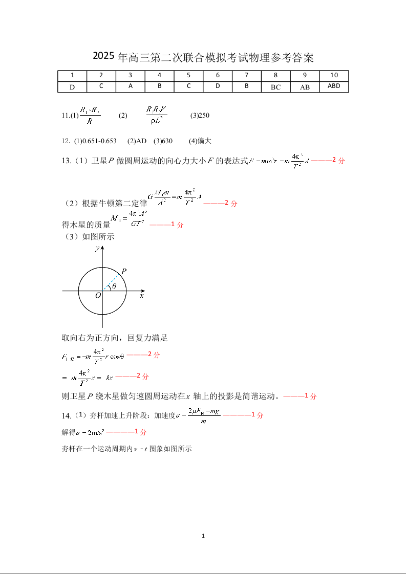 哈师大附中、东北师大附中、辽宁省实验中学2025届高三第二次联合模拟考试物理答案