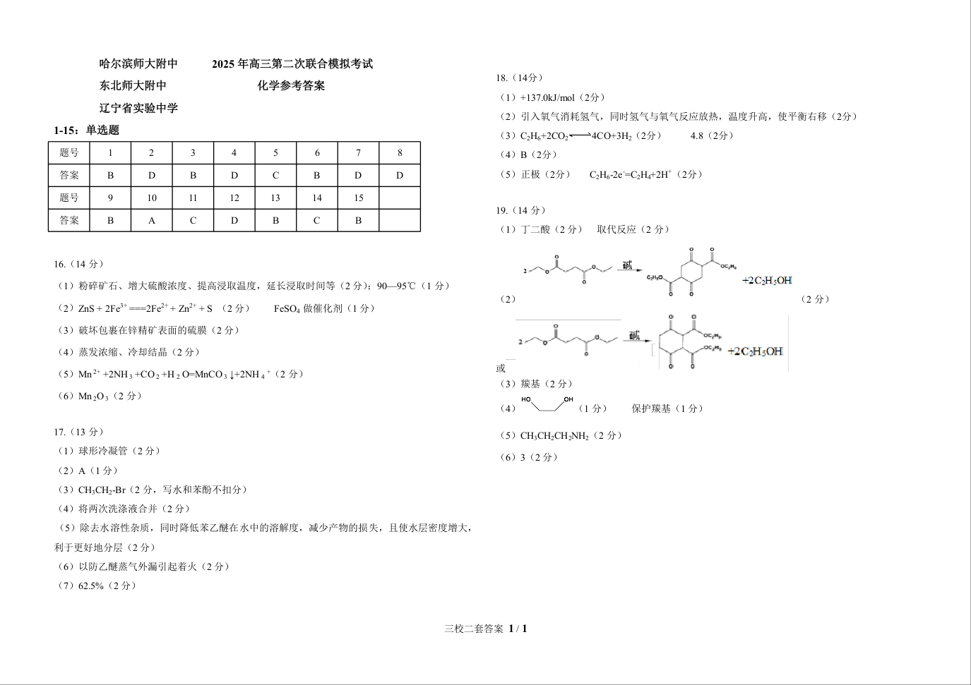 哈师大附中、东北师大附中、辽宁省实验中学2025届高三第二次联合模拟考试化学答案