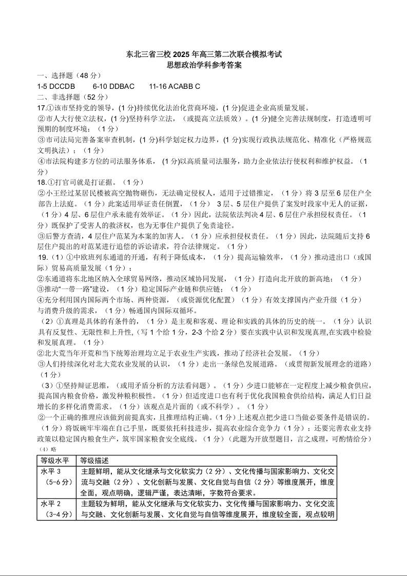 哈师大附中、东北师大附中、辽宁省实验中学2025届高三第二次联合模拟考试政治答案