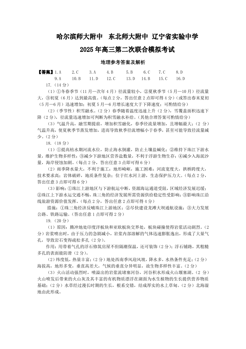 哈师大附中、东北师大附中、辽宁省实验中学2024-2025学年下学期高三二模联考地理答案