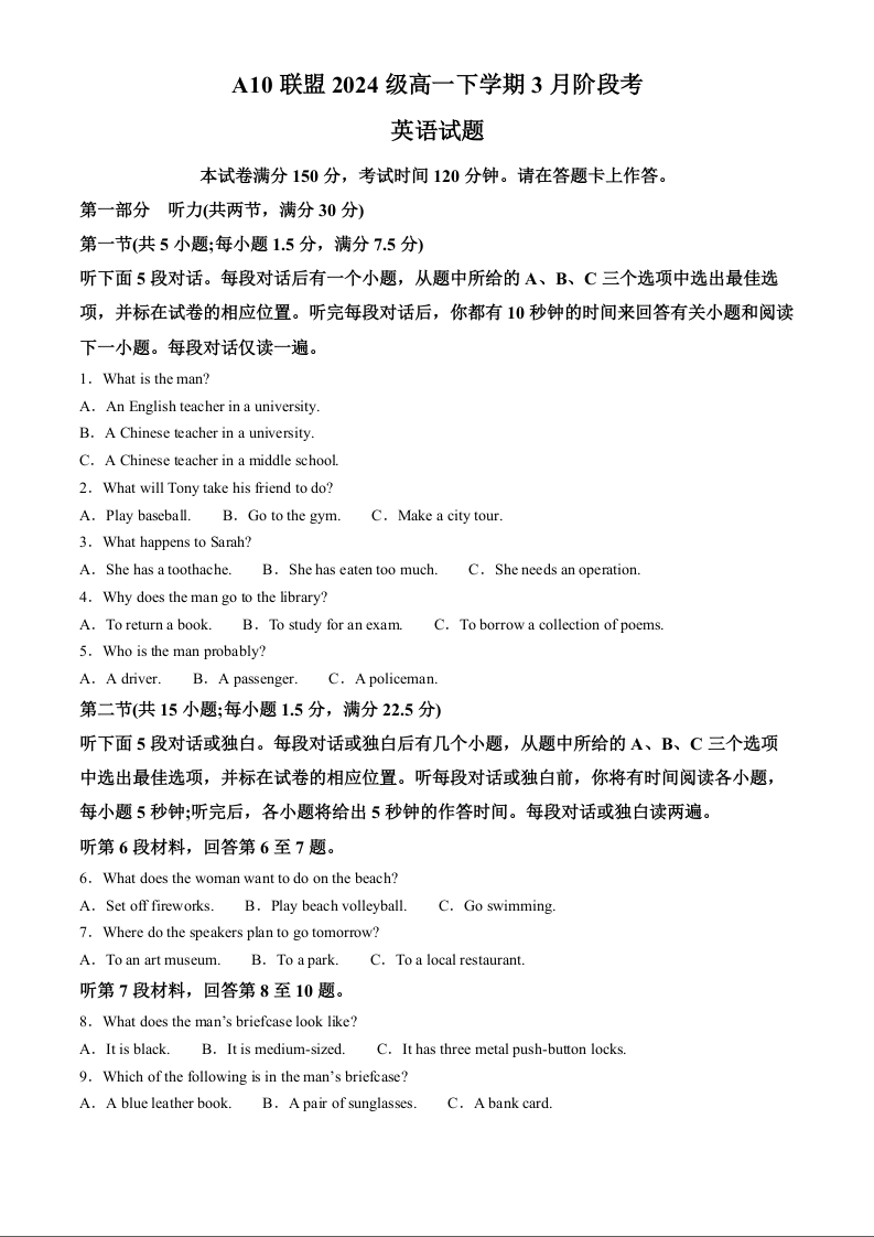 安徽省A10联盟2024-2025学年下学期3月高一阶段考试英语+答案