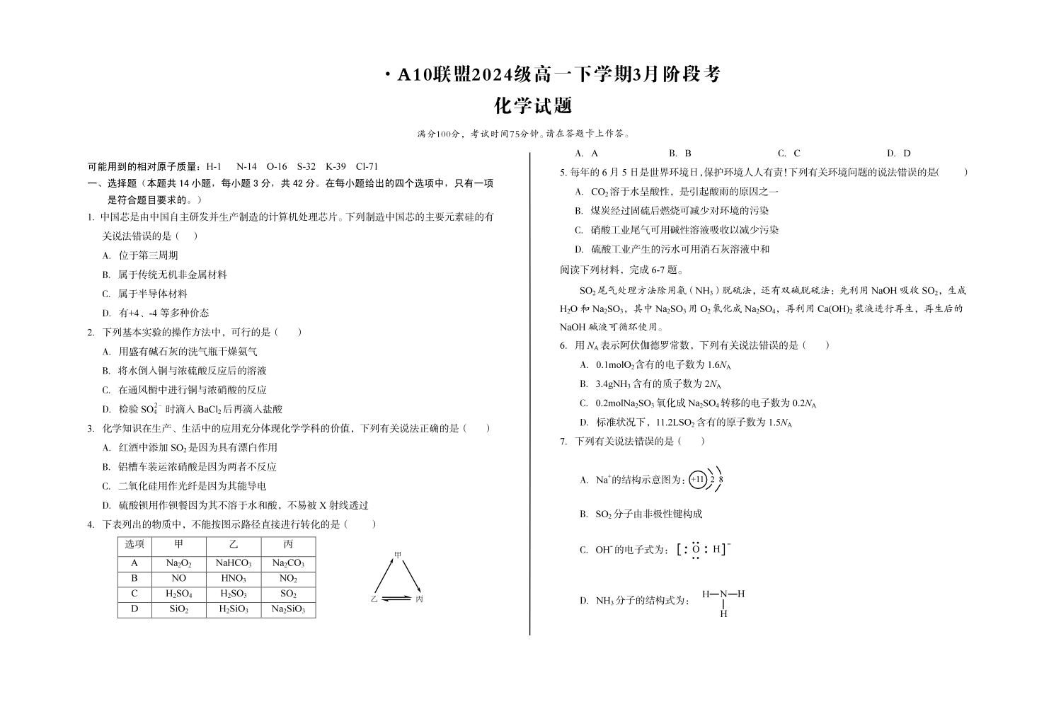 安徽省A10联盟2024-2025学年下学期3月高一阶段考试化学+答案
