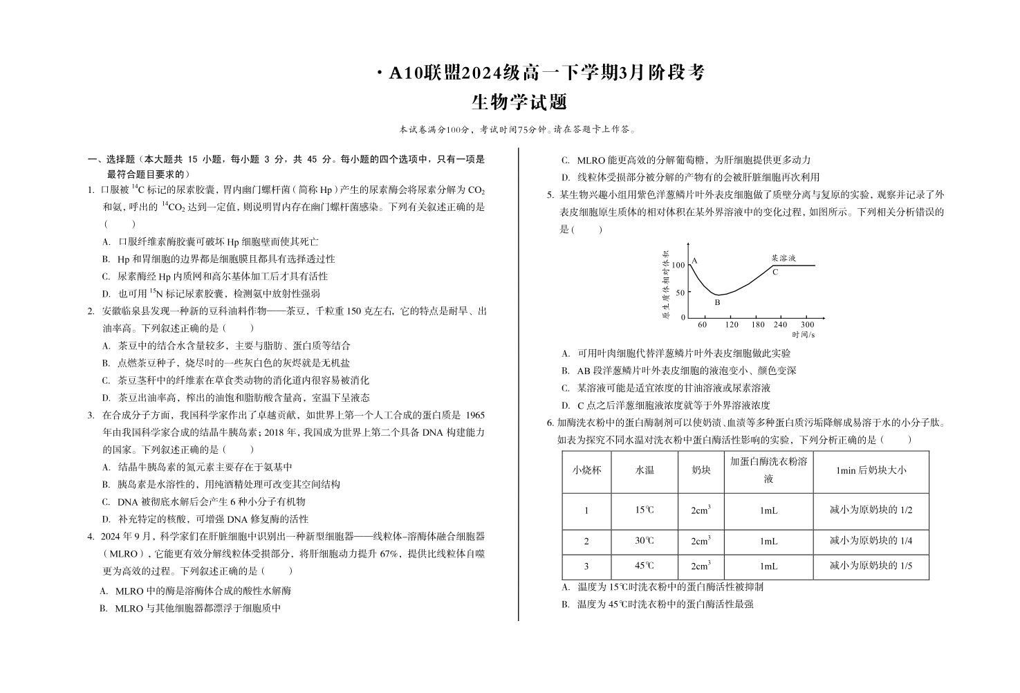 安徽省A10联盟2024-2025学年下学期3月高一阶段考试生物+答案