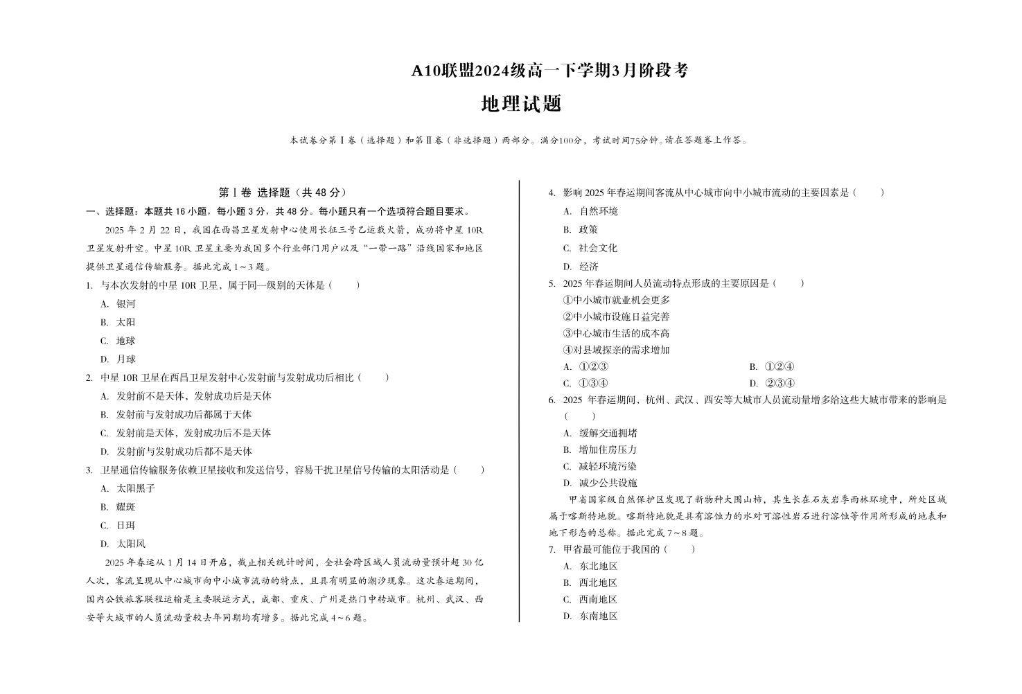 安徽省A10联盟2024-2025学年下学期3月高一阶段考试地理+答案