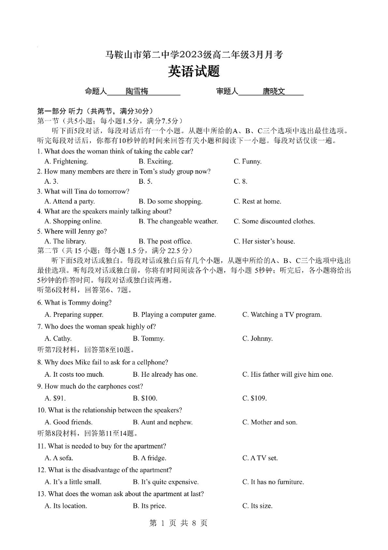 安徽省马鞍山市二中2024-2025学年下学期3月高二月考英语+答案