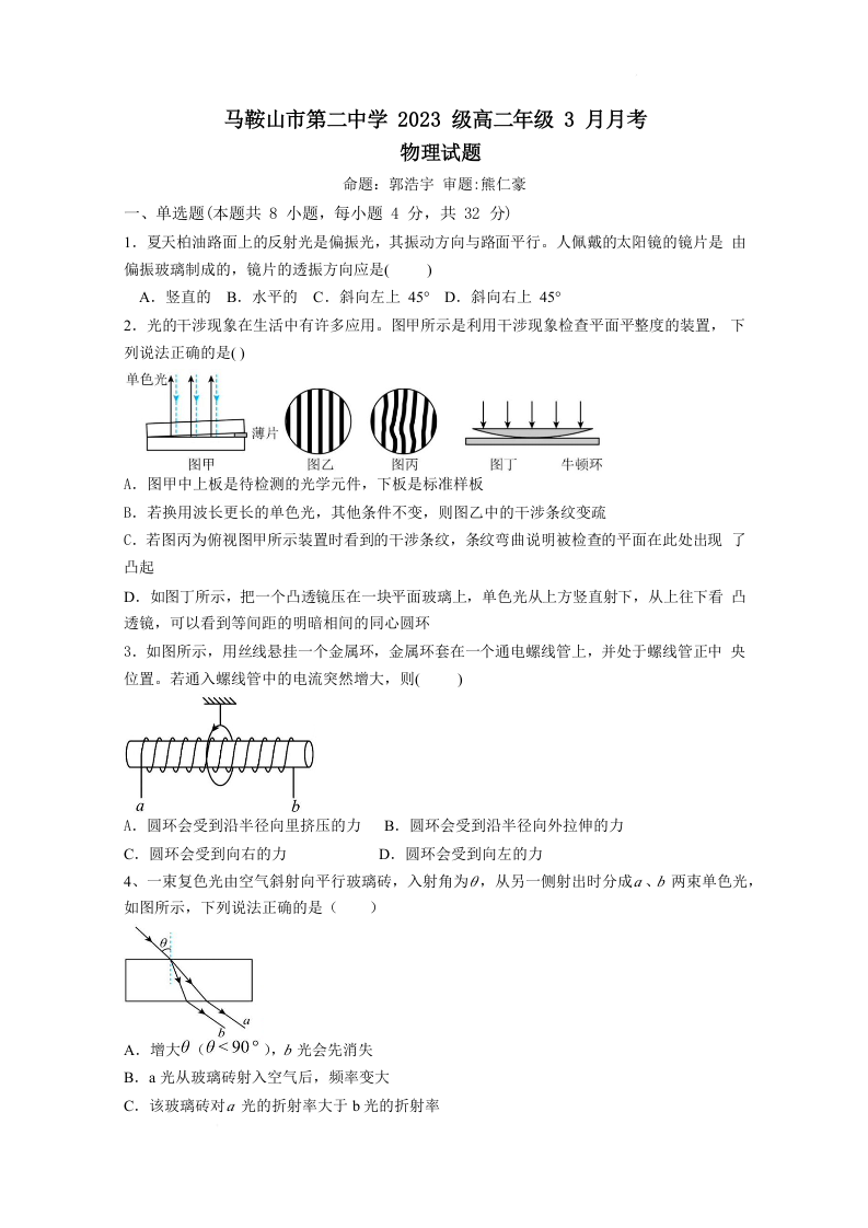 安徽省马鞍山市二中2024-2025学年下学期3月高二月考物理+答案