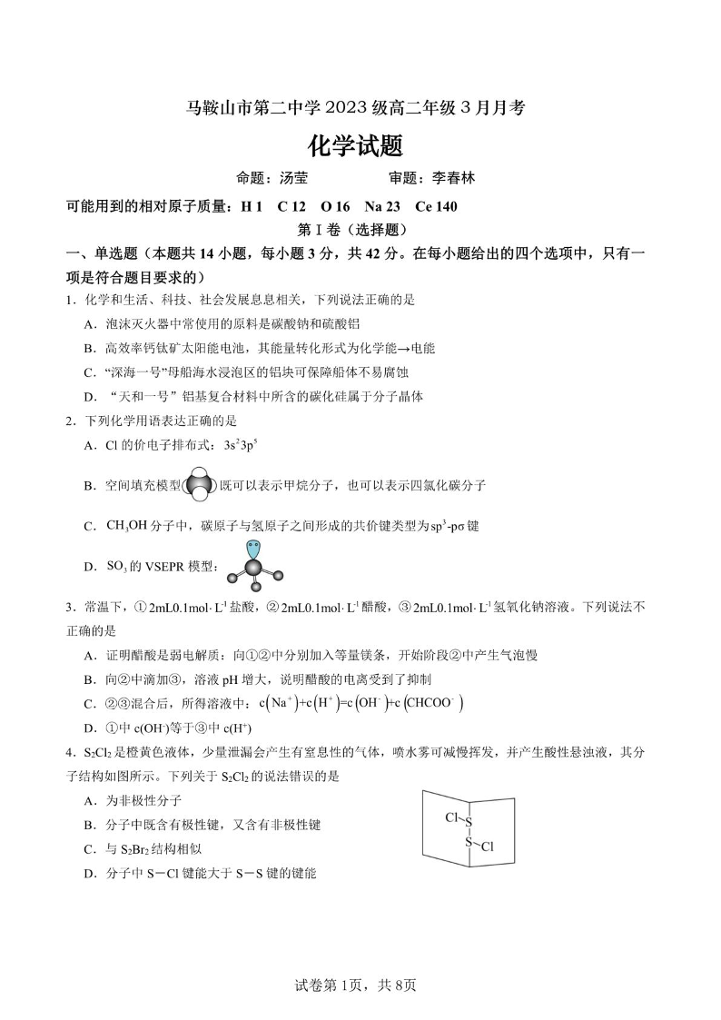 安徽省马鞍山市二中2024-2025学年下学期3月高二月考化学+答案