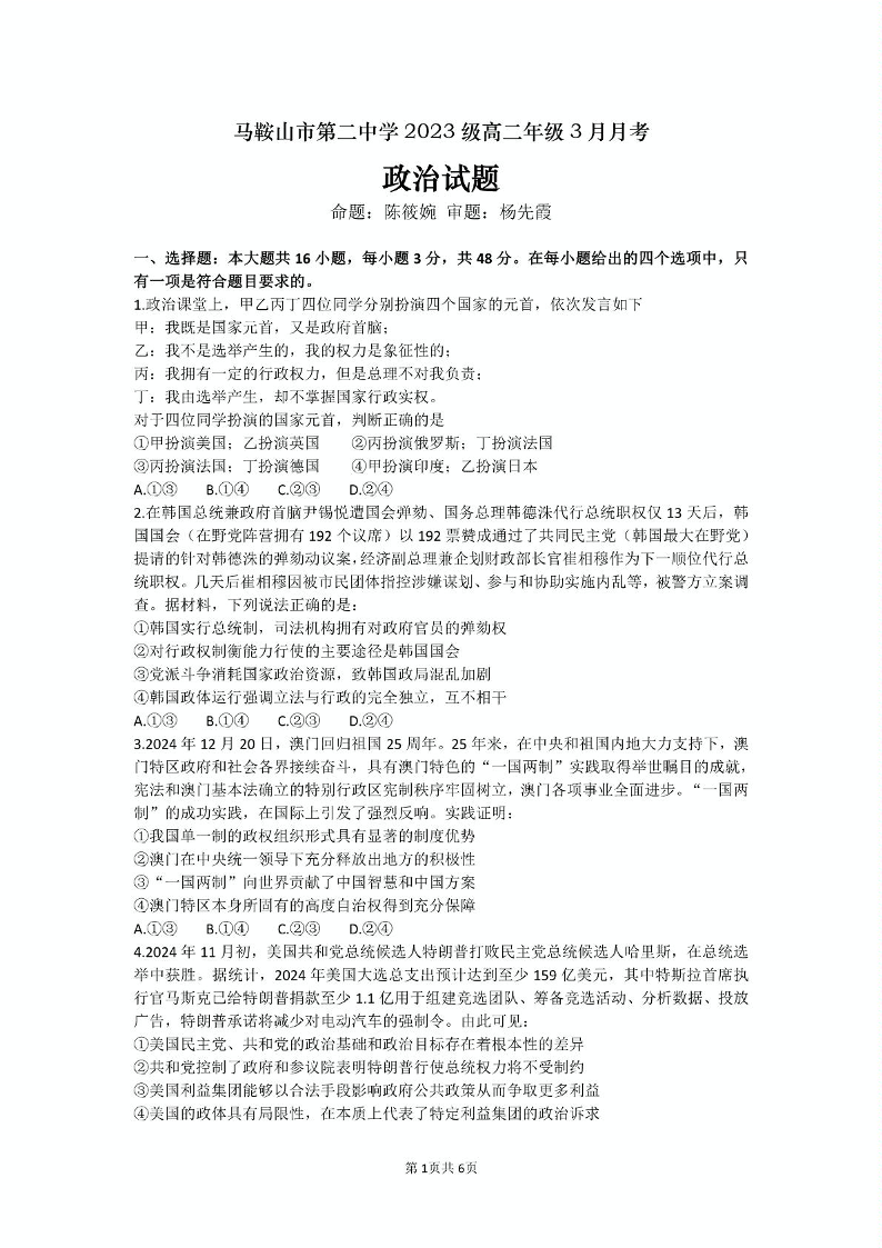 安徽省马鞍山市二中2024-2025学年下学期3月高二月考政治+答案