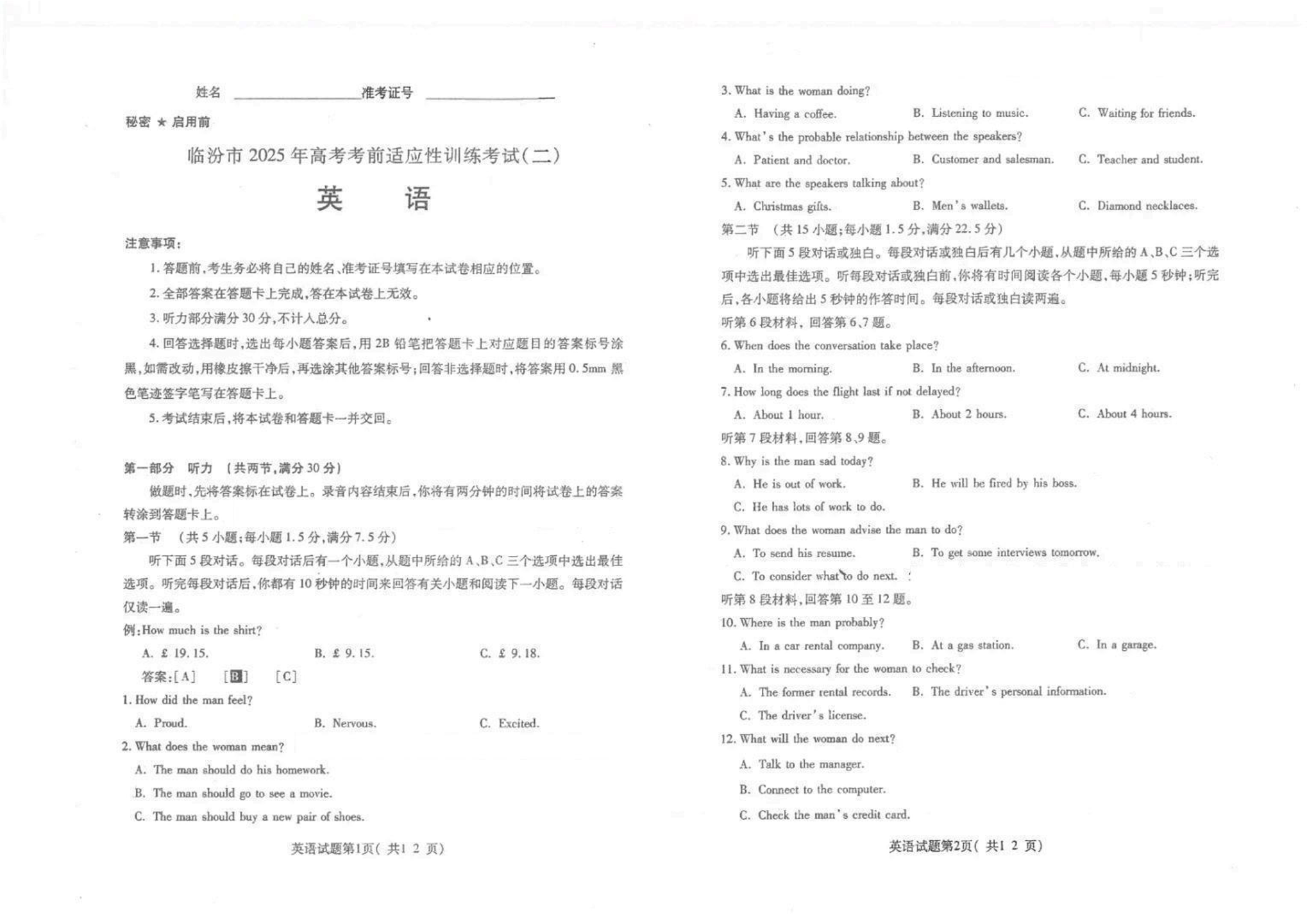 山西省临汾市2024-2025学年下学期高三第二次模拟考试英语