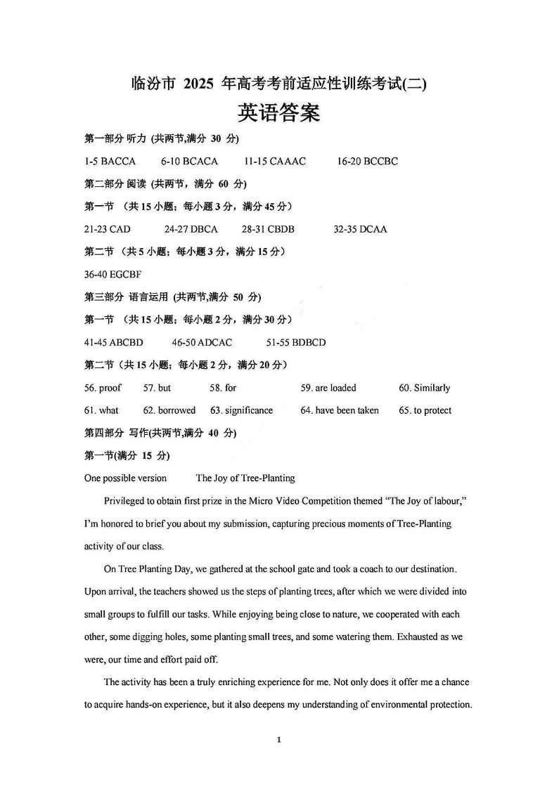 山西省临汾市2024-2025学年下学期高三第二次模拟考试英语答案