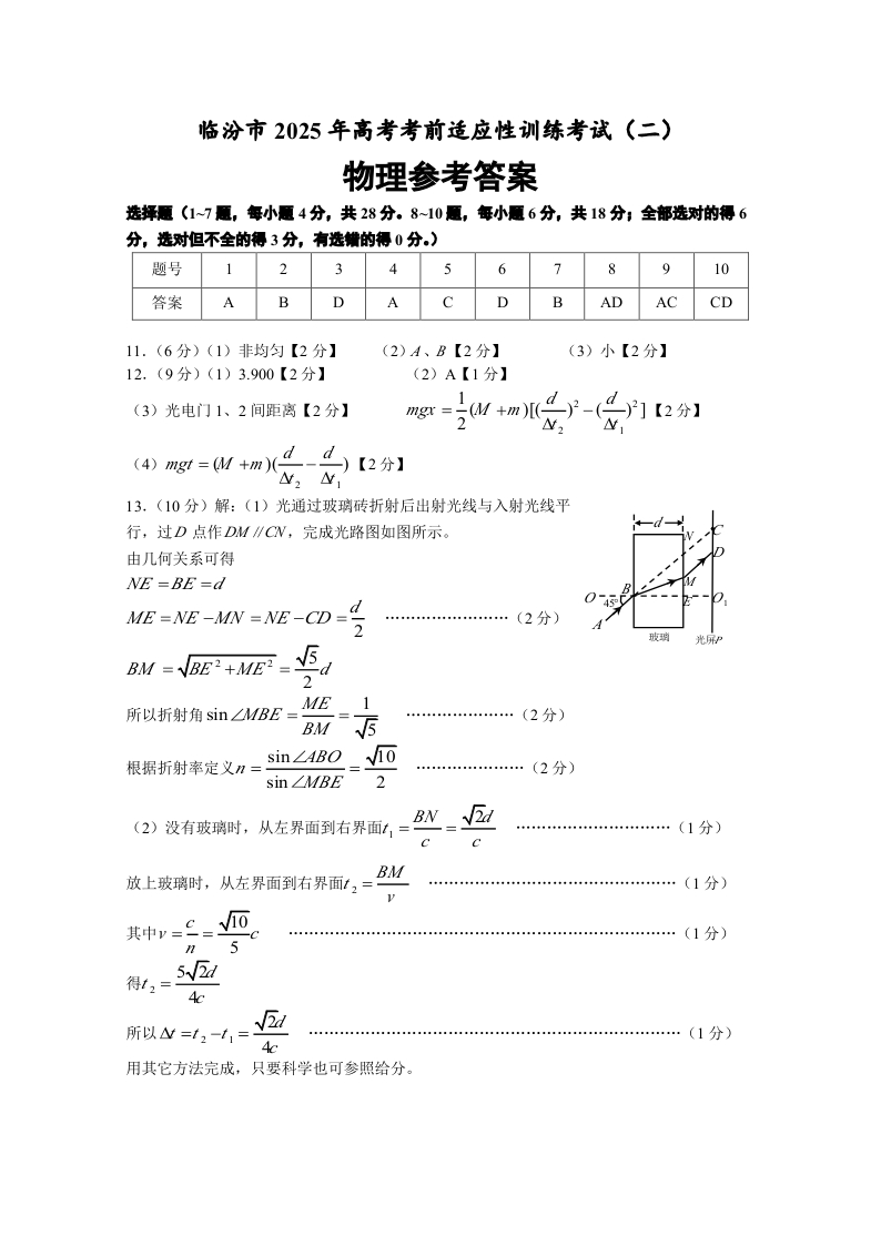山西省临汾市2024-2025学年下学期高三第二次模拟考试物理答案