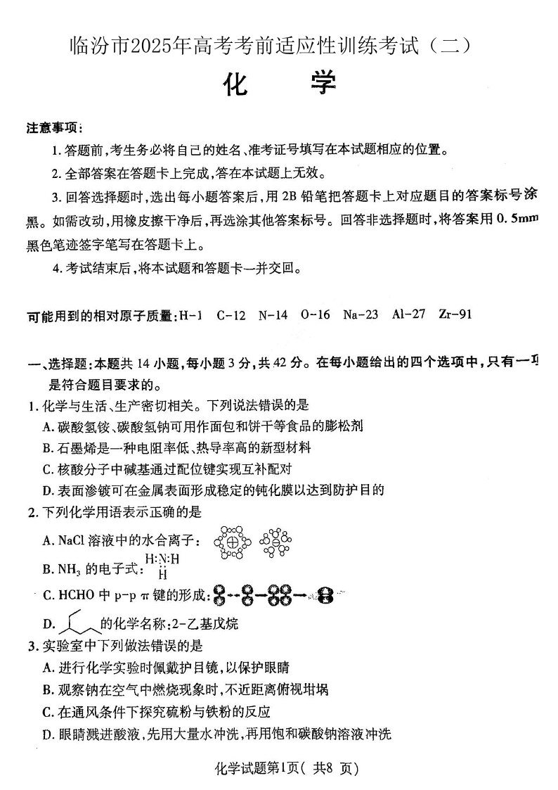 山西省临汾市2024-2025学年下学期高三第二次模拟考试化学+答案