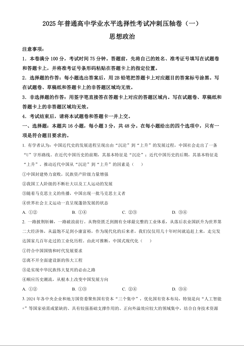 2025年普通高中学业水平选择性考试冲刺压轴卷(一)政治+答案